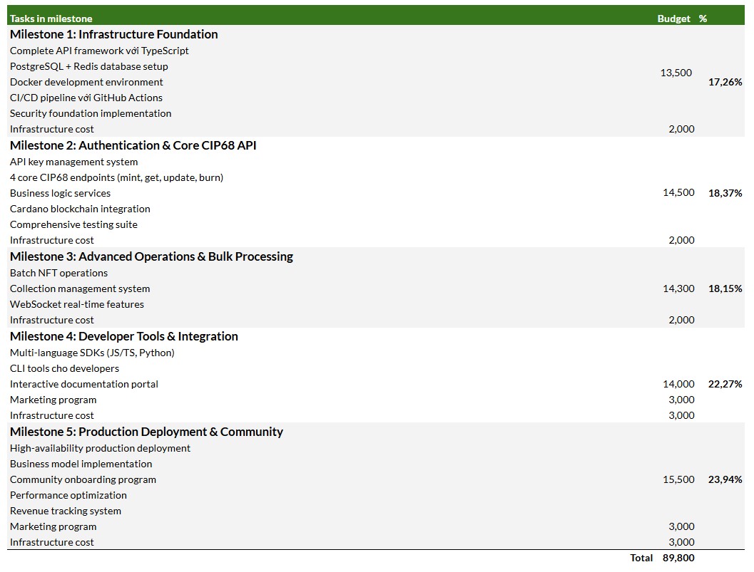 Based on the budget table provided, here's a comprehensive cost breakdown of the proposed CIP68 NFT API project:
