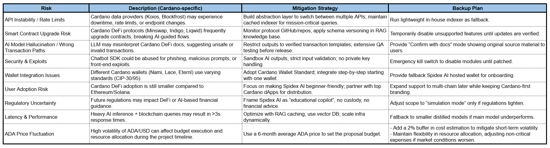 Like any complex DeFi and AI integration, the proposed solution for Spidex AI must carefully account for risks that are specific to Cardano’s ecosystem. These risks span from API dependencies and protocol upgrades to user adoption challenges and regulatory uncertainty. To ensure resilience, we have mapped out each risk with a clear mitigation strategy and a backup plan to minimize disruption.