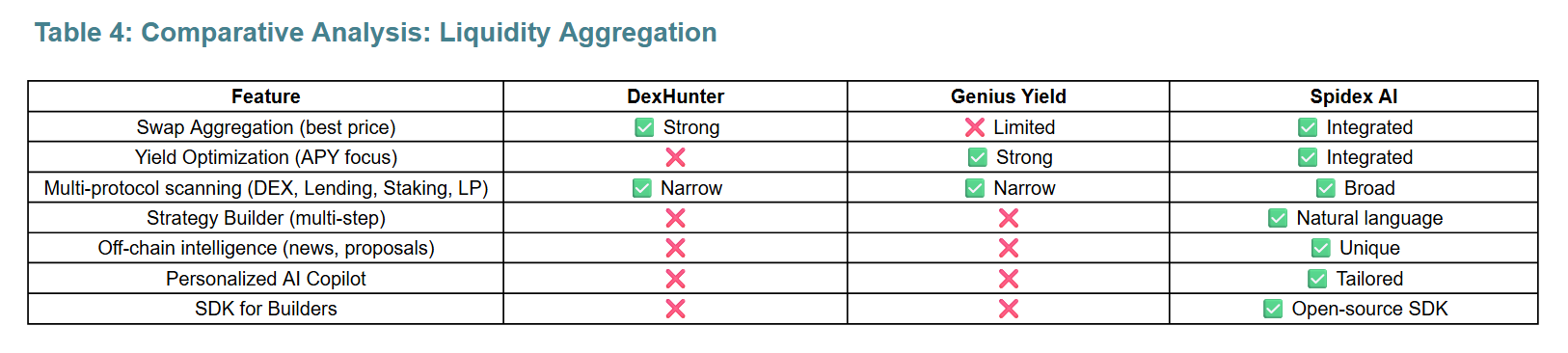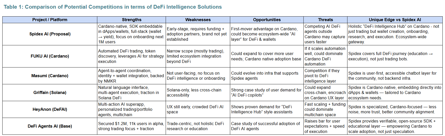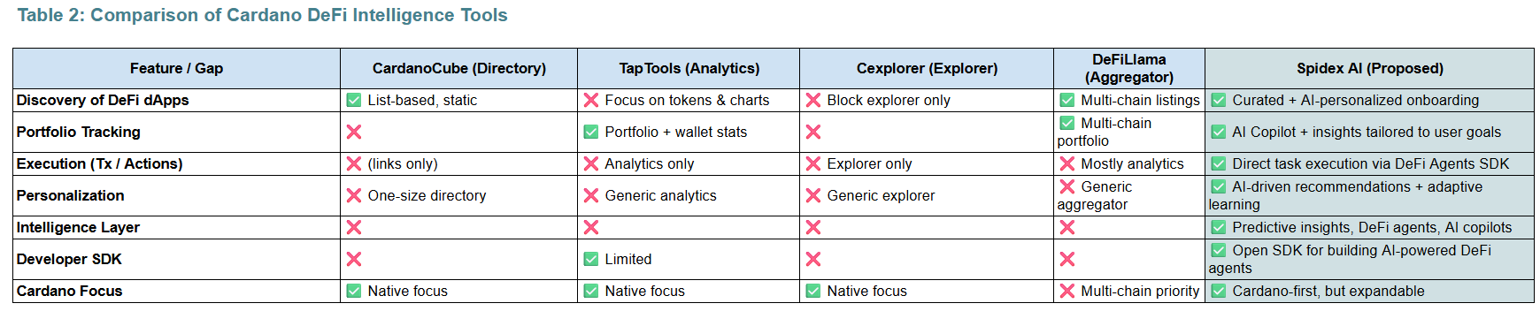The comparative analysis indicates a persistent market gap: beyond directories, token analytics, explorers, and multi-chain aggregators, Cardano still lacks a Cardano-first, AI-personalized intelligence and execution layer with a developer SDK, which Spidex AI is built to close.