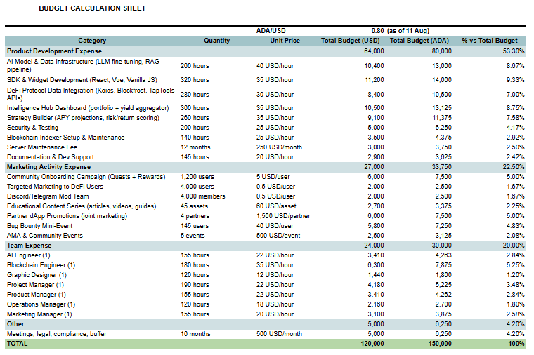 The total estimated budget required to develop and deliver Spidex AI – AI Copilot for Cardano DeFi & SDK for Builders is $150,000. (4.2% risk management of over total budget)
