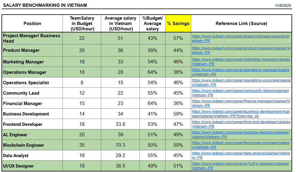 Our team operates at 36–57% lower salary benchmarks compared to similar AI/blockchain product teams in the US, EU, or Singapore, due to strategic location in emerging tech hubs with lower cost-of-living.