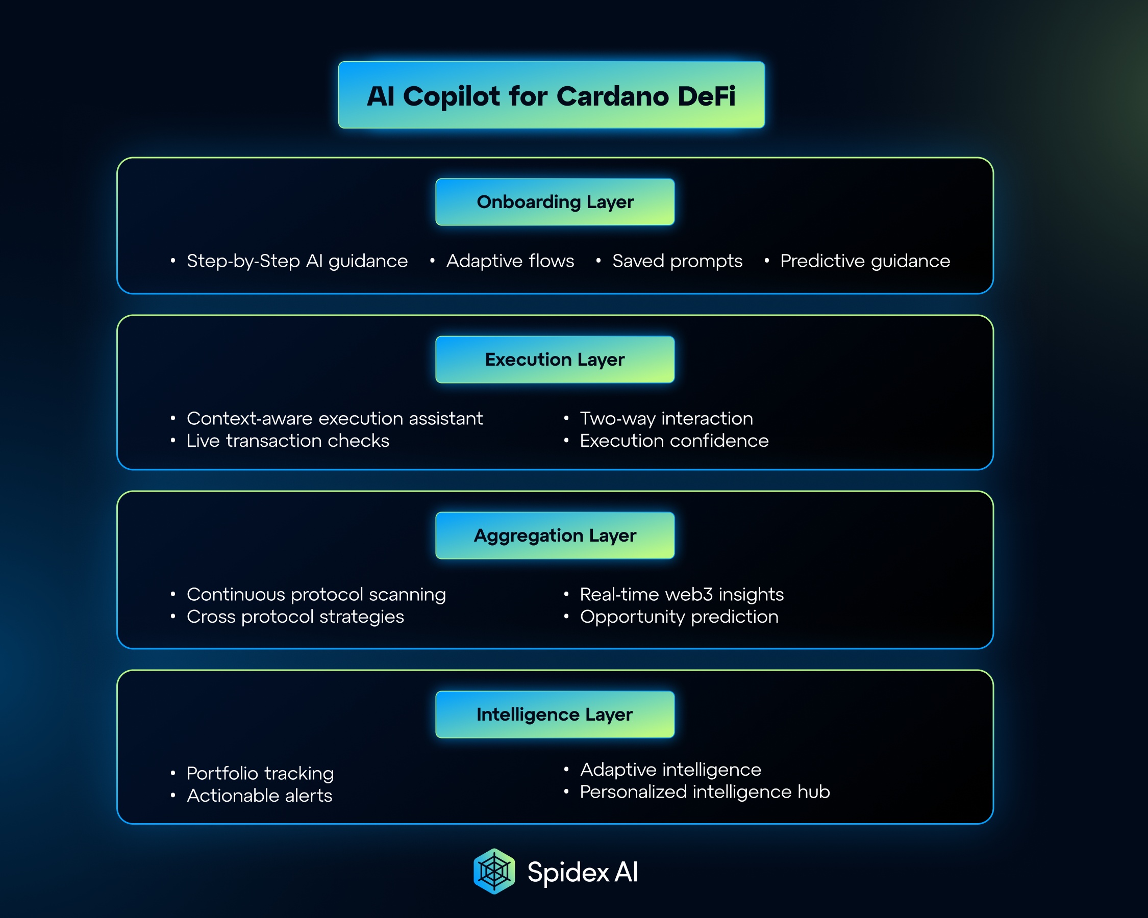 To address the fragmentation and complexity in Cardano DeFi, Spidex AI is designed around four integrated layers. Each layer plays a specific role in guiding users from their very first interaction to advanced strategy building, while ensuring intelligence, safety, and personalization at every step: