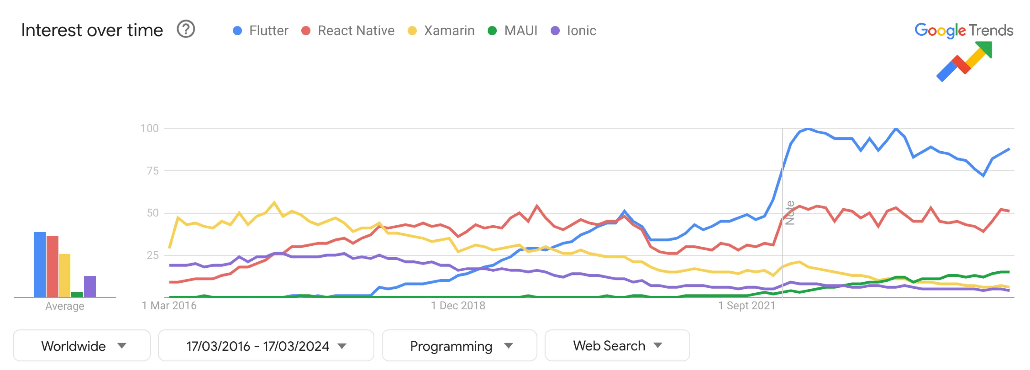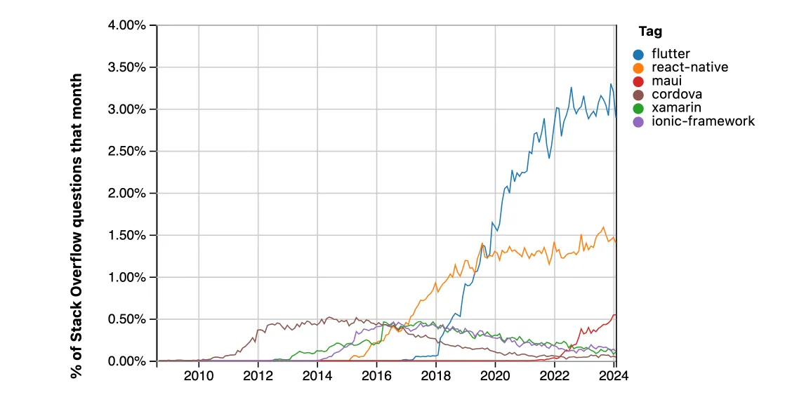 Flutter has decisively won the cross-platform race, 3.3% of Stack Overflow questions vs React Native's 1.6%, with Google Trends showing Flutter dominance since 2021. Yet Web3 tooling remains JavaScript-based, creating a critical gap.
