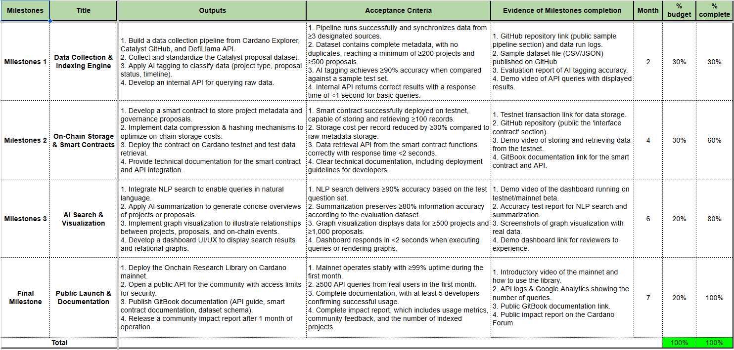 - A dApp On-chain Research Library that operates by indexing at least 500 Cardano projects and 1,000 governance proposals in its first version.