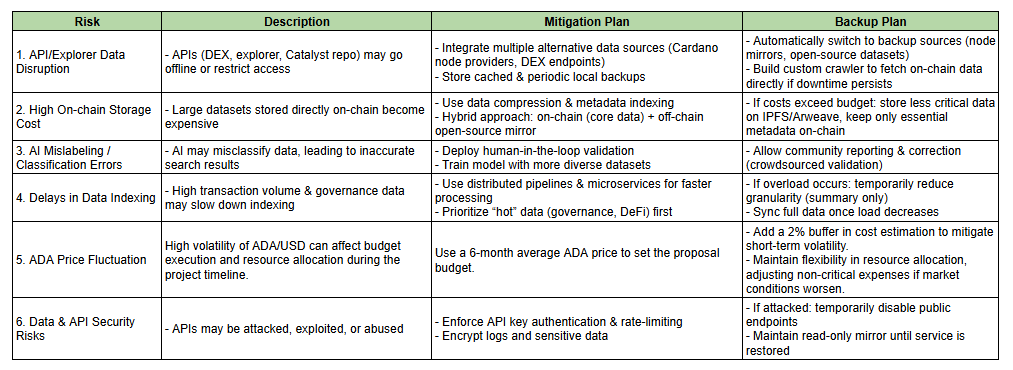 Building Spidex AI on Cardano involves certain risks related to data, infrastructure, and AI performance. Our Risk Plan identifies these challenges in advance and sets clear measures to minimize disruption while ensuring system reliability.