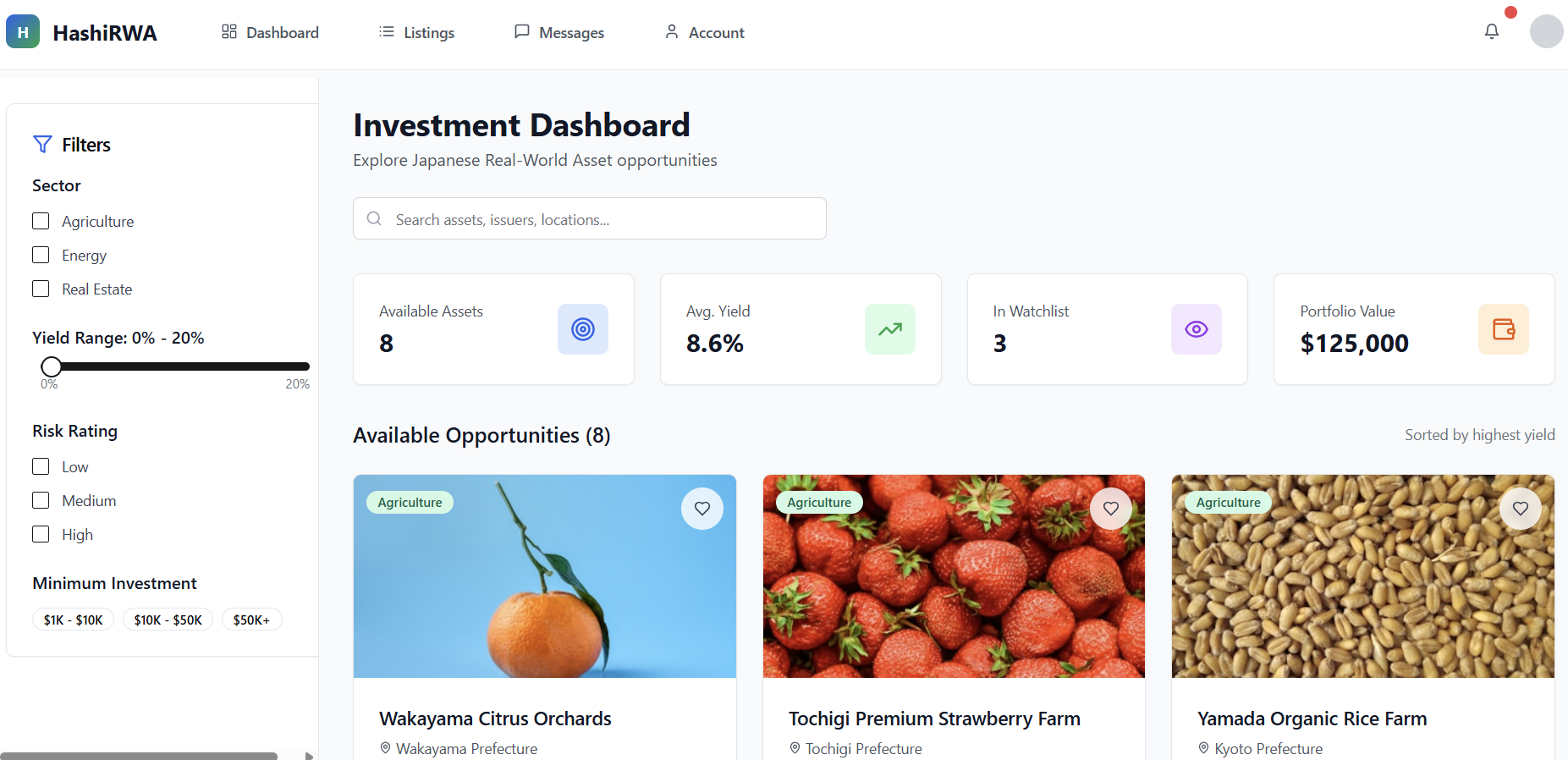 Illustrative mock-up of the HashiRWA dashboard, showing how agricultural RWAs can be onboarded, validated, and tracked by investors in a simple interface.