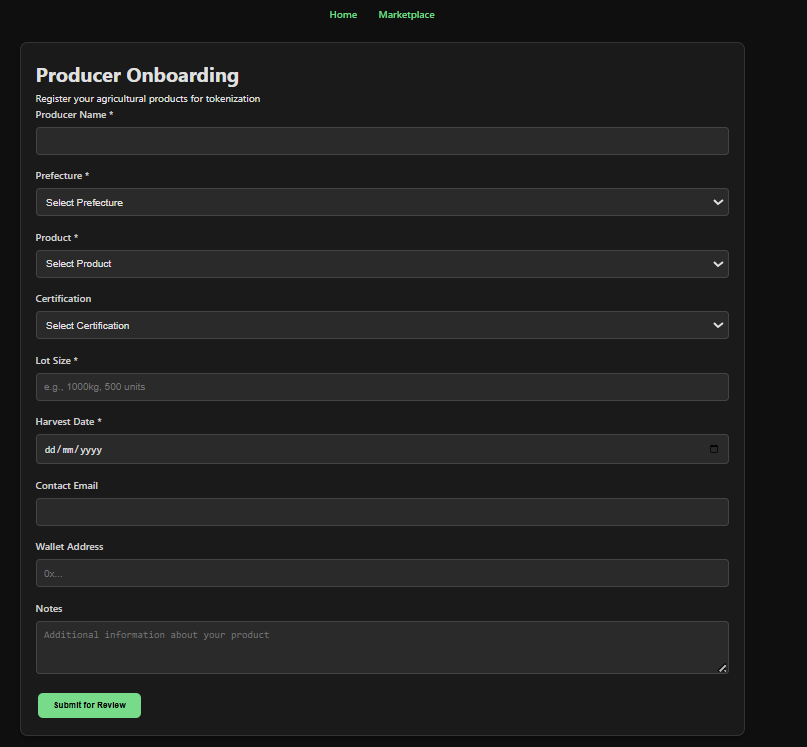 Producer Onboarding Form: Aggregating Asset Data. Licensed issuers submit product details, certifications, harvest dates, and lot sizes for verification.