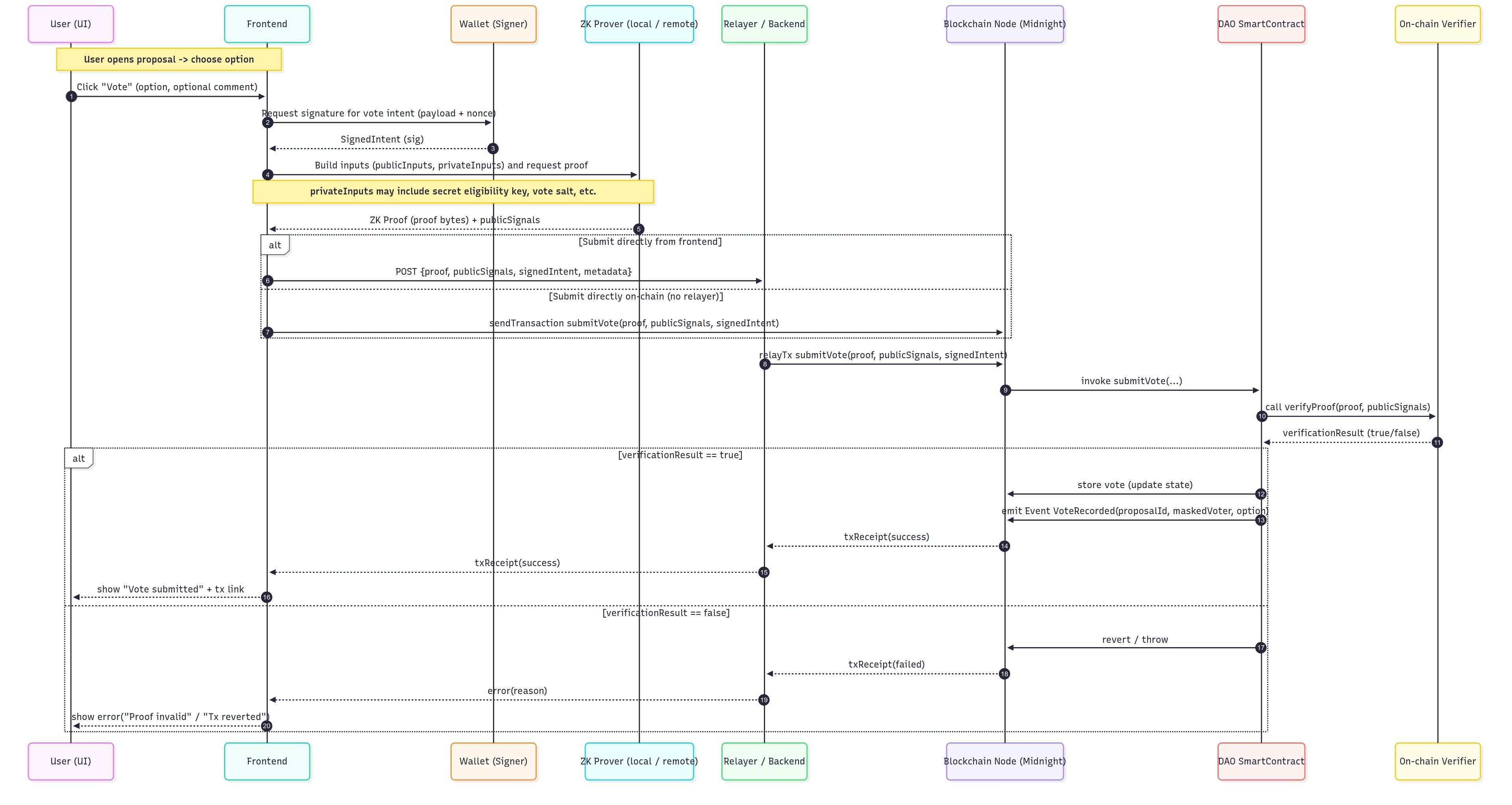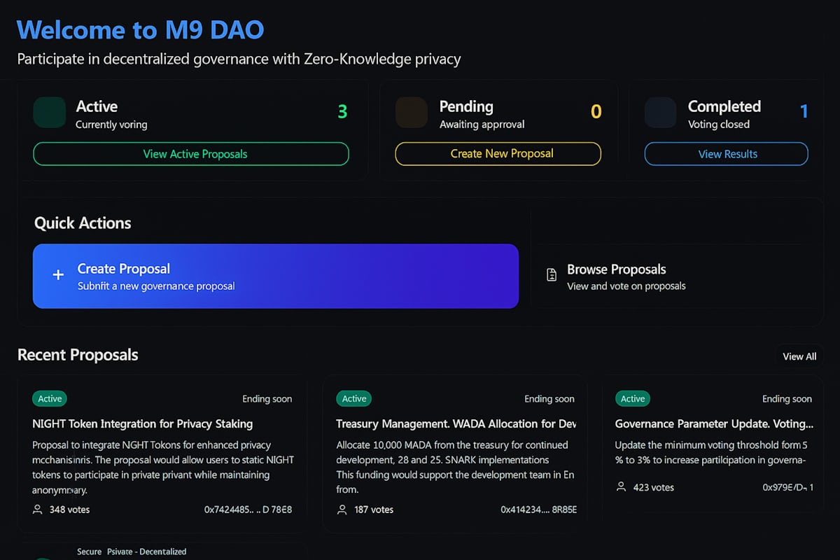 By pairing ZK proofs with a clean, intuitive UI/UX, the project lowers the barrier for non-technical DAO participants. This serves as a reference implementation for developers building privacy-first tools on Cardano and Midnight.