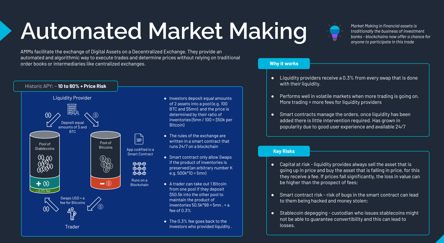 We have written extensively and taught university classes on AMM DEXs. A diagram below for university students with an example of an AMM for BTCUSDC: