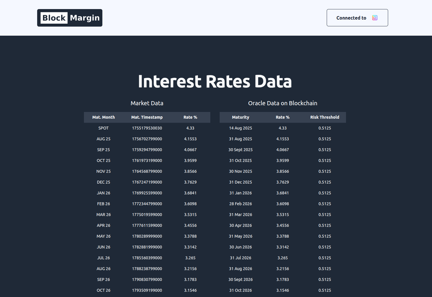 This milestone will integrate the interest rate curve data model into the Charlie3 infrastructure. Unlike traditional oracles, which typically provide a single price, this oracle is designed to deliver a full interest rate curve with multiple maturity points, enabling more complex financial applications such as interest rate derivatives. The design of this oracle was first developed during the BlockMargin testnet build using proprietary data and our unique data model. Since then, we have worked closely with Charlie3, who have agreed to adapt their infrastructure to support this specialized use case.