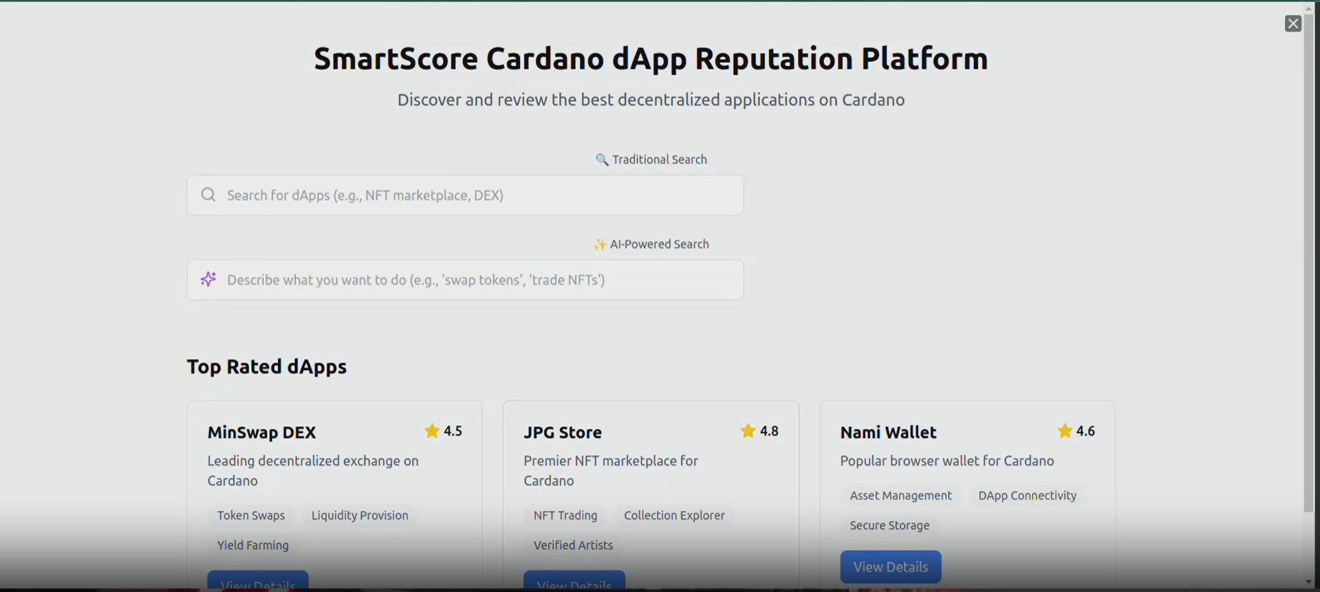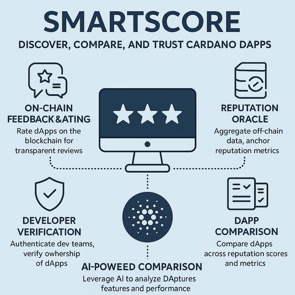 SmartScore, is designed to redefine how decentralized applications (dApps), developers, and innovations are discovered, evaluated, and trusted within the Cardano ecosystem.