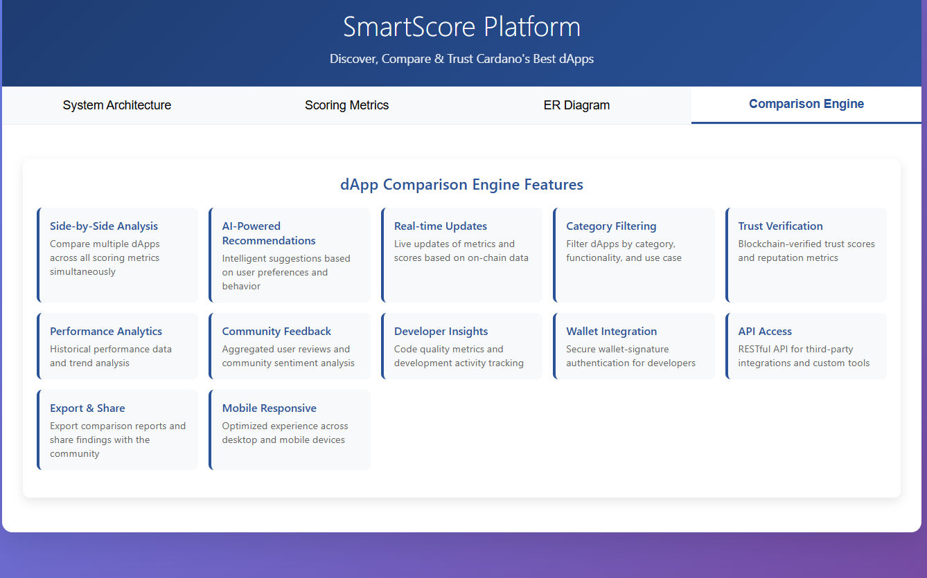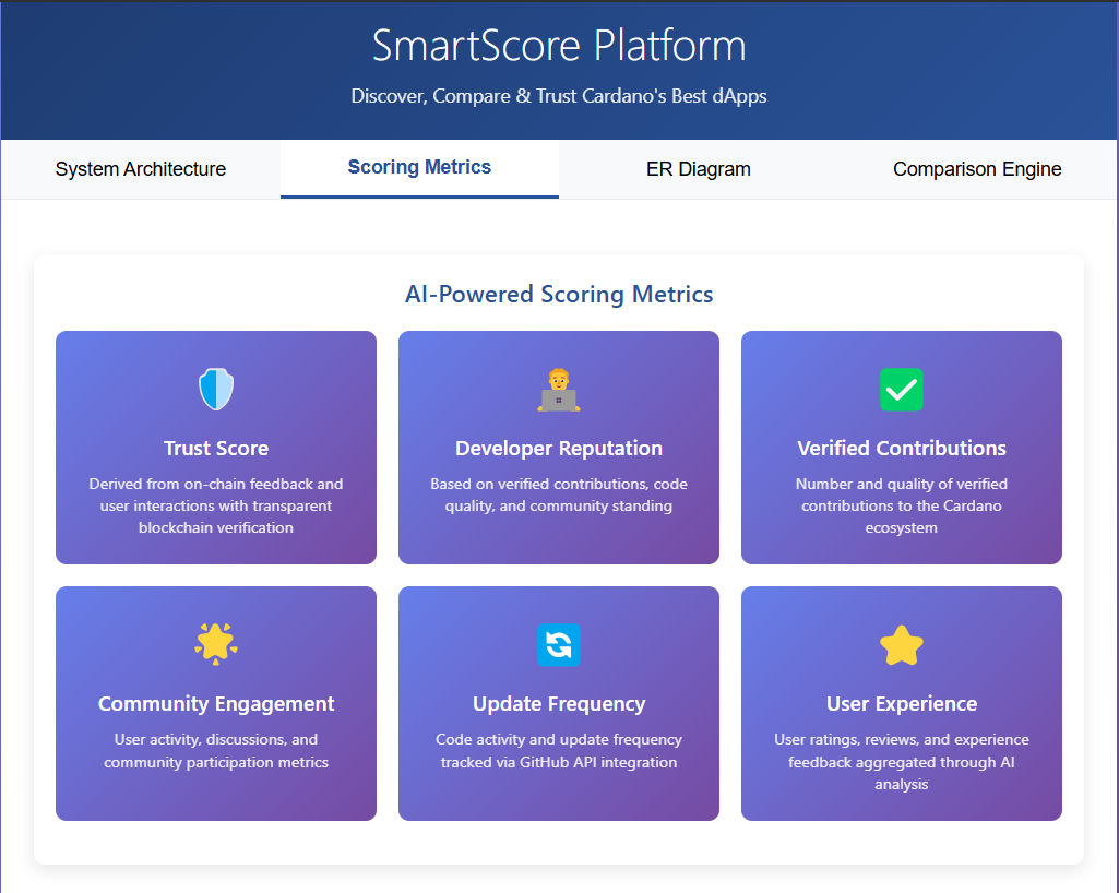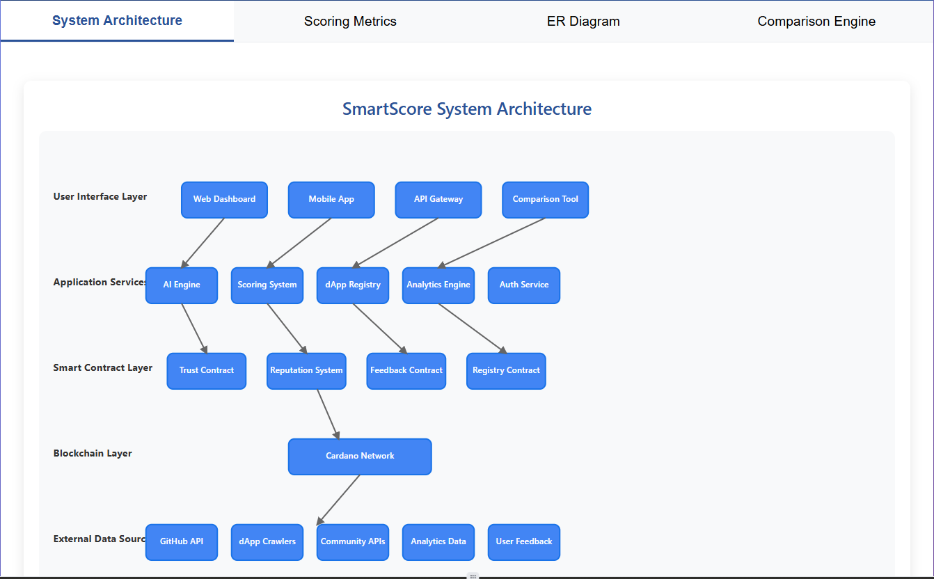 SmartScore is a decentralized platform designed to bring transparency, trust, and intelligent comparison to Cardano dApps by leveraging Intelligent AI models and on-chain smart contracts. The platform functions as an intelligent explorer that allows users to discover, evaluate, and compare dApps based on multiple reputation metrics all anchored to Cardano’s blockchain infrastructure for transparency and verifiability.