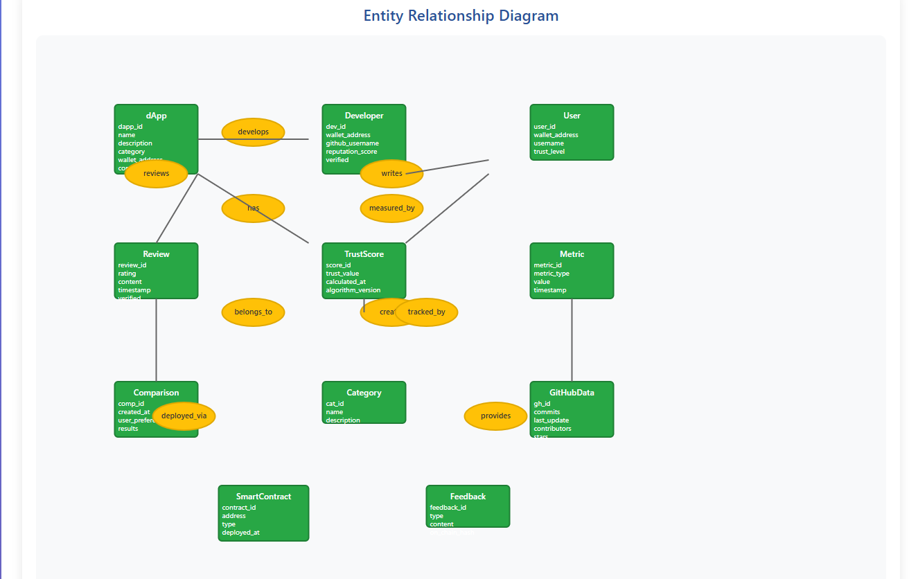This milestone delivers the core SmartScore comparison engine and AI-powered search functionality. The system will integrate the on-chain rating data with off-chain developer activity to produce aggregated trust scores. AI/ML models will be trained to provide intelligent dApp recommendations based on user preferences. The frontend comparison dashboard will be implemented, allowing users to compare dApps side-by-side using real-time data from both blockchain and the reputation oracle.