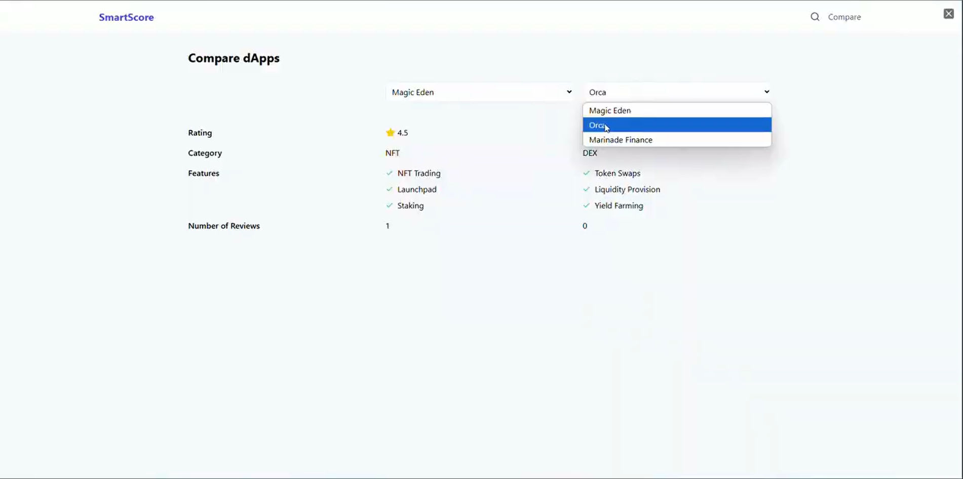 The SmartScore platform provides a robust dApp comparison engine, allowing users to compare applications side-by-side based on: