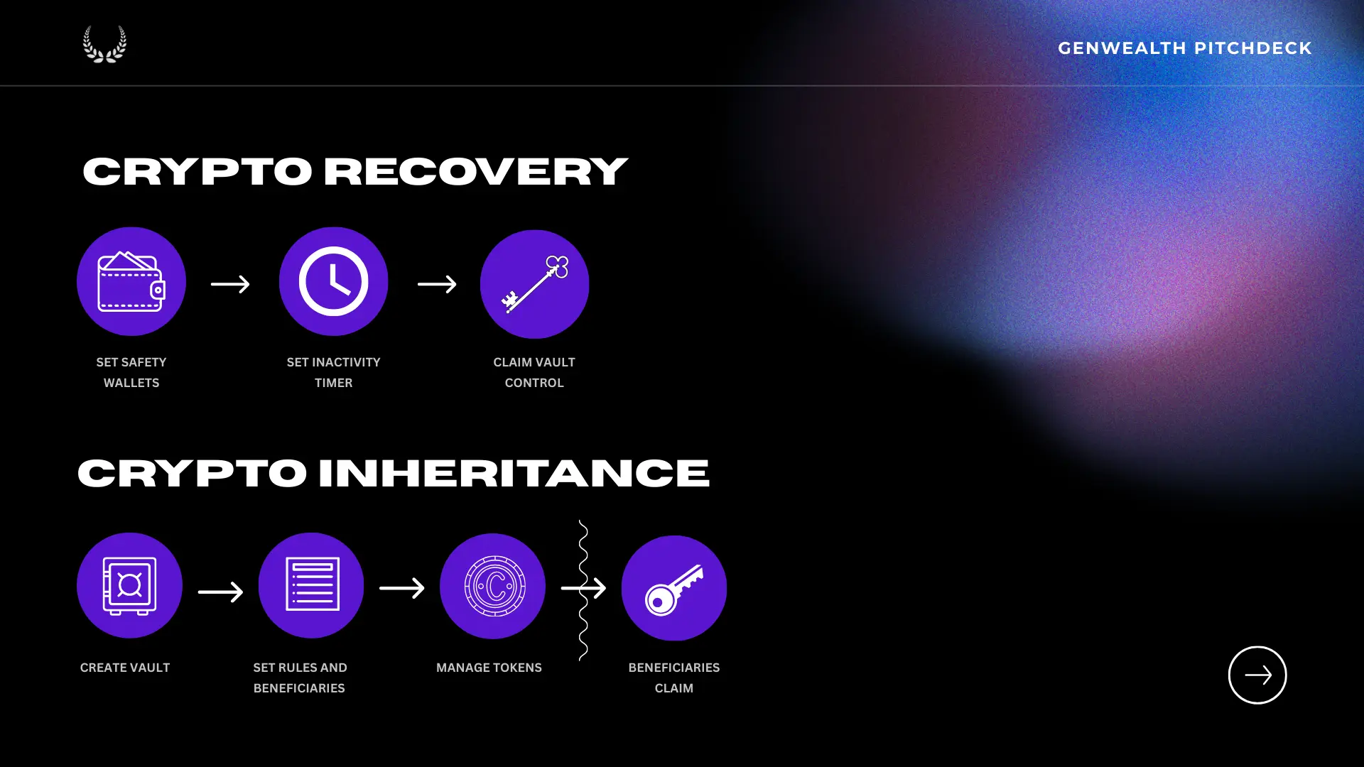 VanEck estimates that $6 trillion in crypto assets will pass through the inheritance process over the next 20 years. Without reliable solutions, much of this wealth risks being lost. GenWealth is building that solution: a crypto inheritance and recovery DApp that leverages smart contracts, to empower you to define your own inheritance rules and create a “Plan B” for your crypto.