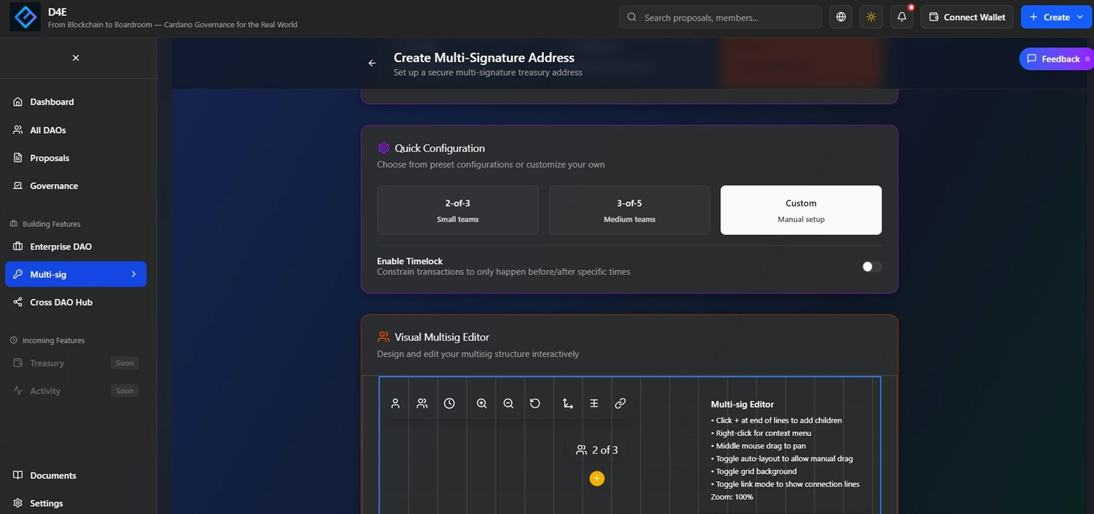With guided workflows, intuitive UI/UX, and testnet safety, D4E makes DAO participation accessible to people without technical expertise. This can help onboard new community members, strengthen voter participation, and diversify governance perspectives.