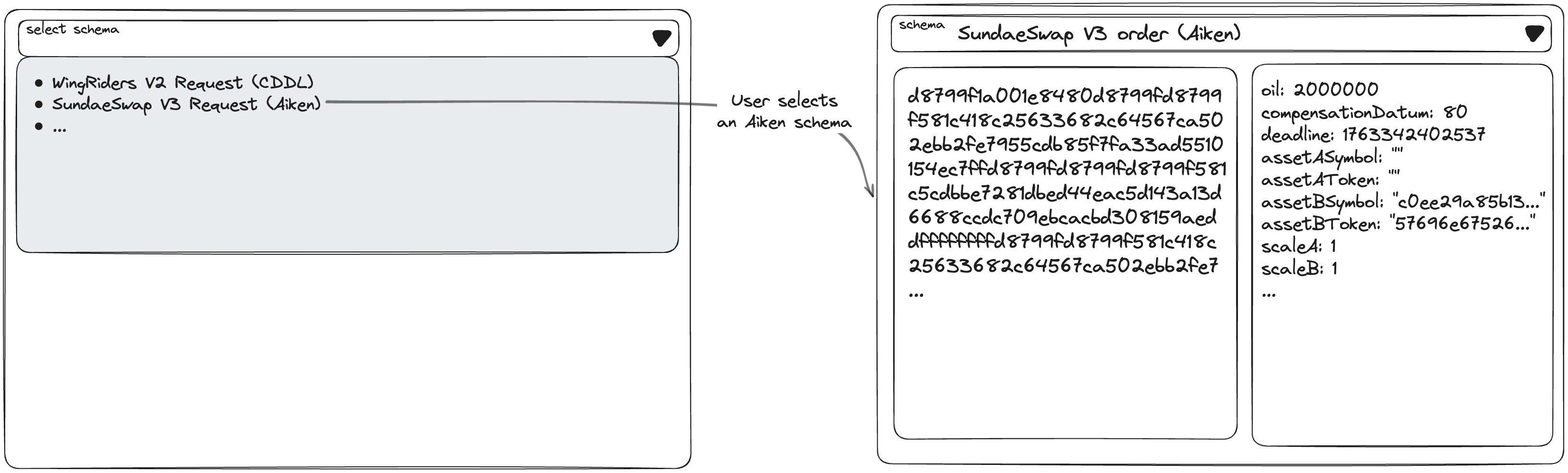 Our approach improves on this: while the current version of Datum Explorer provides some assistance, it struggles with common patterns, doesn’t leverage Plutus Contract Blueprint, supports only a limited set of schemas, and still requires a separate, minimal UI. Our solution addresses these limitations, making CBOR decoding more accurate, intuitive, and integrated.
