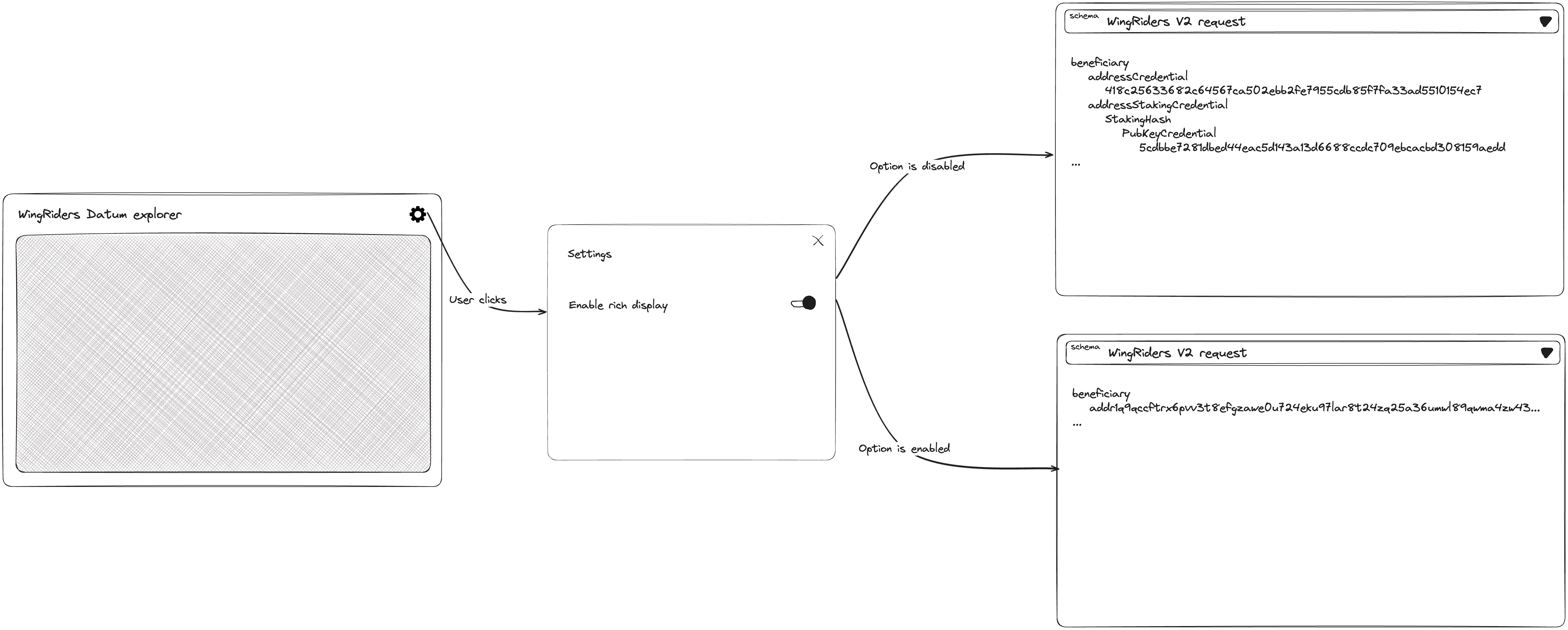 - Custom rendering of common data structures:Common constructs like addresses, transaction hashes, and tokens will be shown in intuitive formats. Spending+staking credentials appear as bech32 addresses (clickable/copyable), transaction hashes link directly to explorers, and policyId+assetName are displayed as token tickers with quantities formatted according to decimals from the token registry. Users and projects can customize these displays via schema annotations or UI preferences.