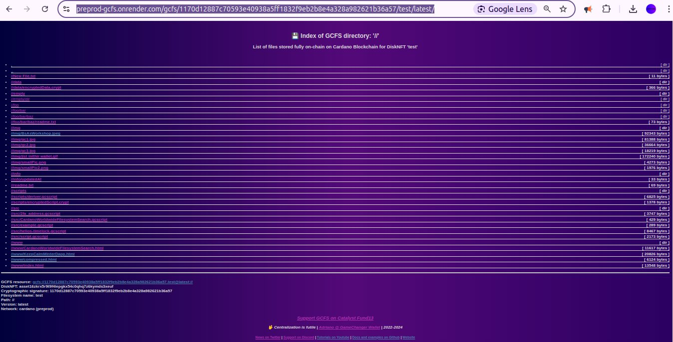 We will build a GCFS Web Server in Typescript ( targetting NodeJs, backends ) for allowing applications to read and search for files stored on-chain as a proper implementation example (current one runs in browsers and Cardano ecosystem seems to prefer more for backend solutions unfortunately - specially considerng how CIP-30 over-complicates this kind of applications and the lack of wide-spread Universal Dapp Connector adoption)