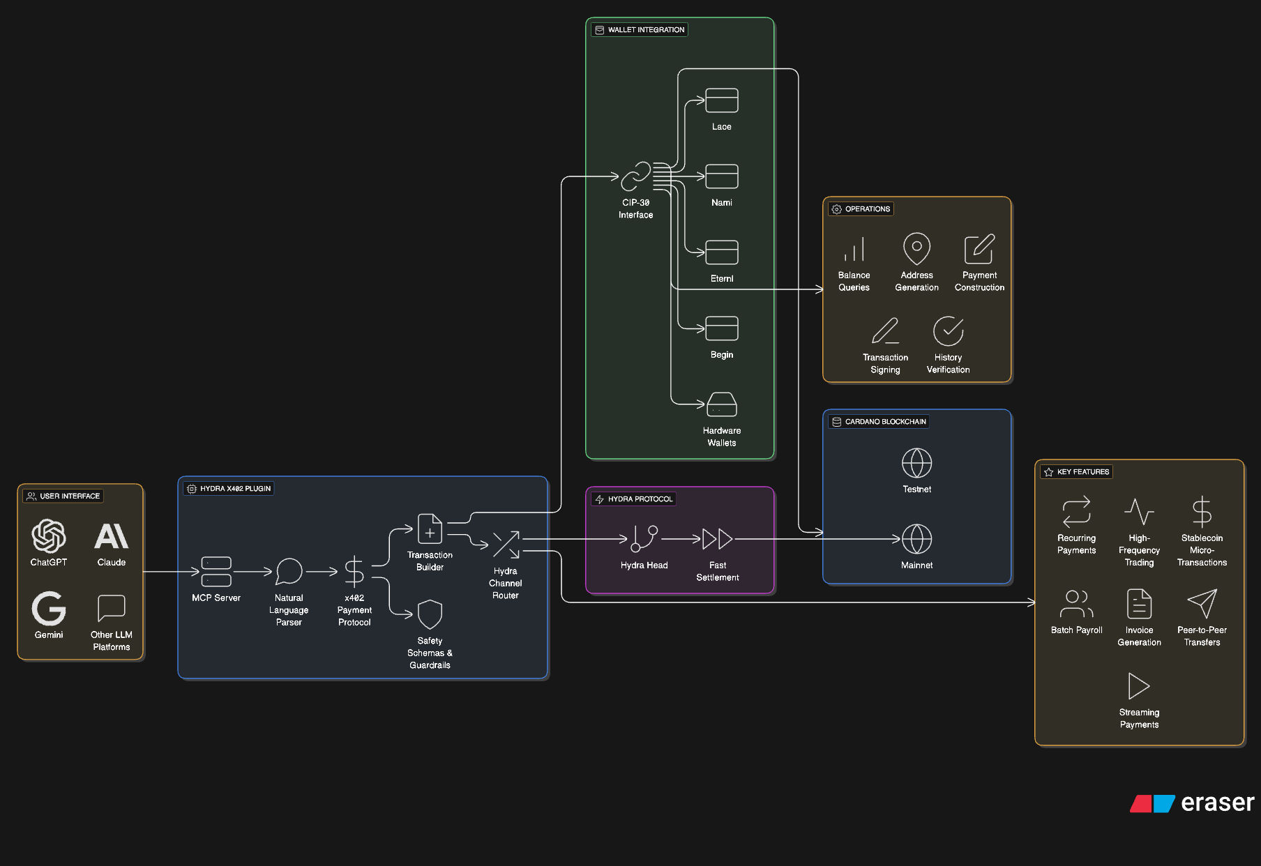 Hydra x402 is built as an MCP-based server connector that allows ChatGPT, Claude, and other LLM platforms to securely interact with Cardano wallets through a browser-embedded CIP-30 wallet-connect layer. The connector operates as a lightweight MCP service exposing a minimal, payment-focused command set: balance queries, address generation, payment construction, and transaction signing while the user’s browser wallet (Lace, Nami, Eternl, begin or hardware extensions) provides non-custodial CIP-30 signing.