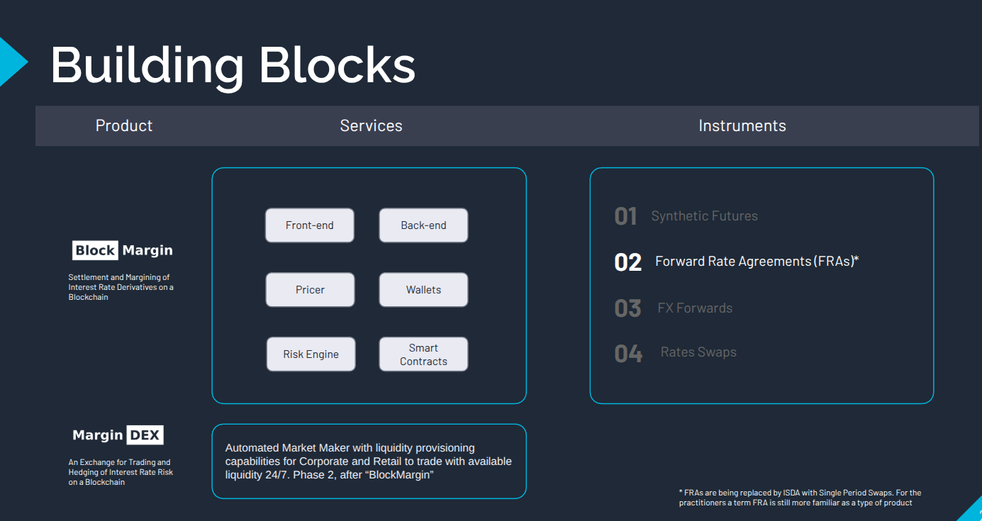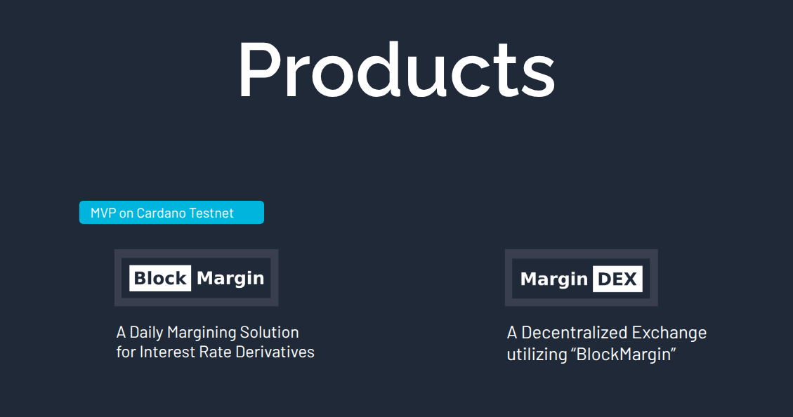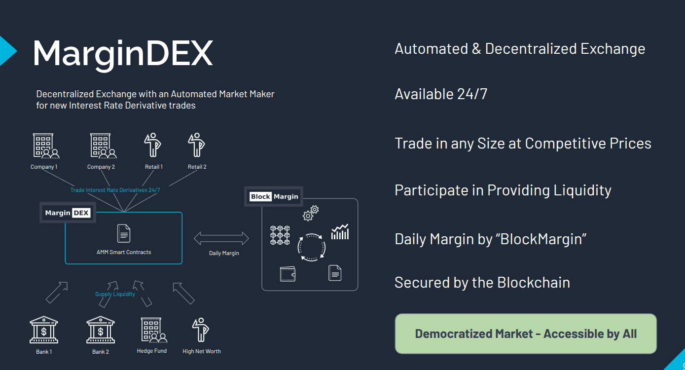 Over the last year we have been working on a platform called BlockMargin to manage the settlement process for interest rate derivatives. It has not been released on the Cardano Testnet and we are actively including in our dicussions with Financial Institutions. MarginDEX is the next evolution of this platform to build a DEX on top of BlockMargin.