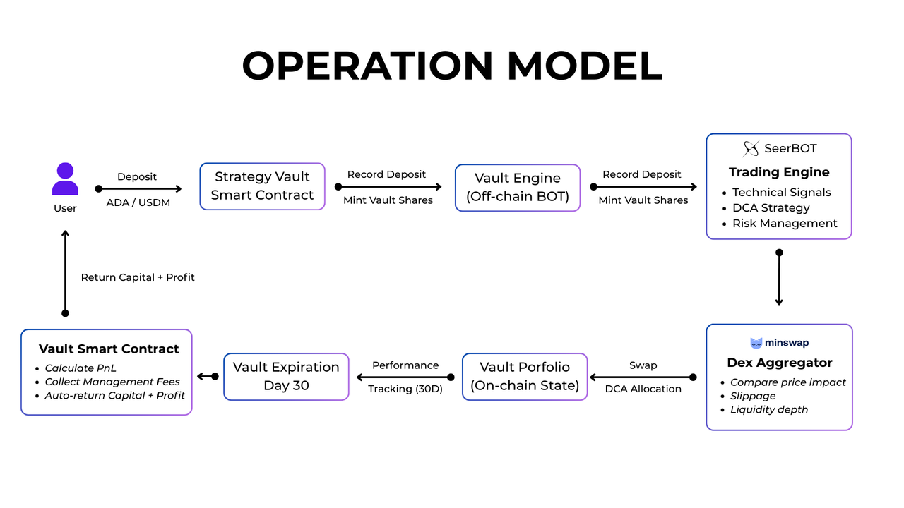 To directly address the "Yield Gap" and "Impermanent Loss" risks identified in our research, SeerBOT proposes the Strategy Vault—a secure, smart contract-based investment vehicle designed specifically for Cardano's eUTxO architecture.