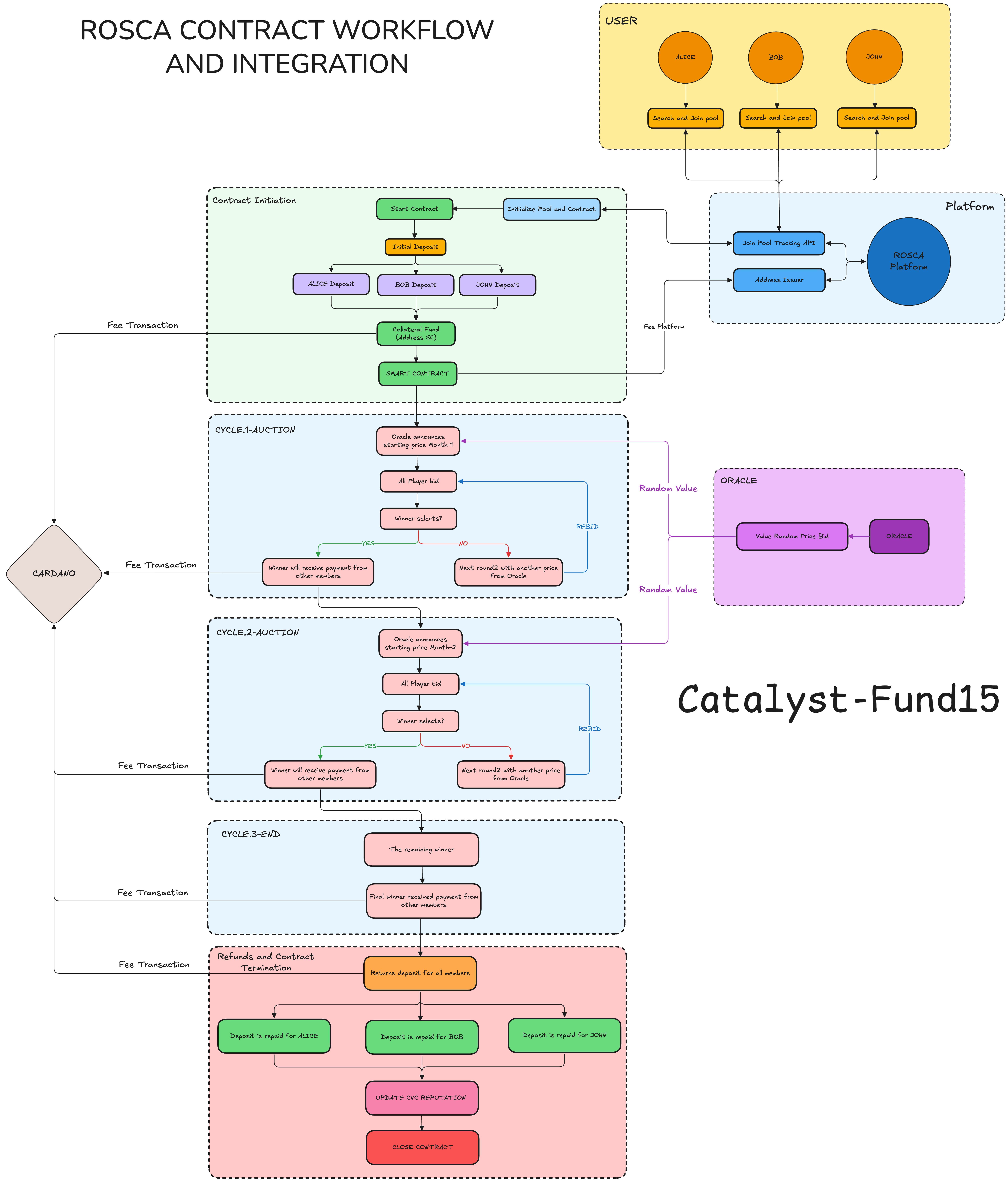 Our ROSCA (Rotating Savings and Credit Association) model introduces innovation by combining the traditional community-based savings mechanism with blockchain-native features tailored to Cardano. While previous funded projects in Catalyst have focused on decentralized lending, staking pools, or microfinance solutions, none have explored a non-liquidation, collateralized ROSCA contract where participants secure their commitments with ADA or stablecoin in a risk-free structure.