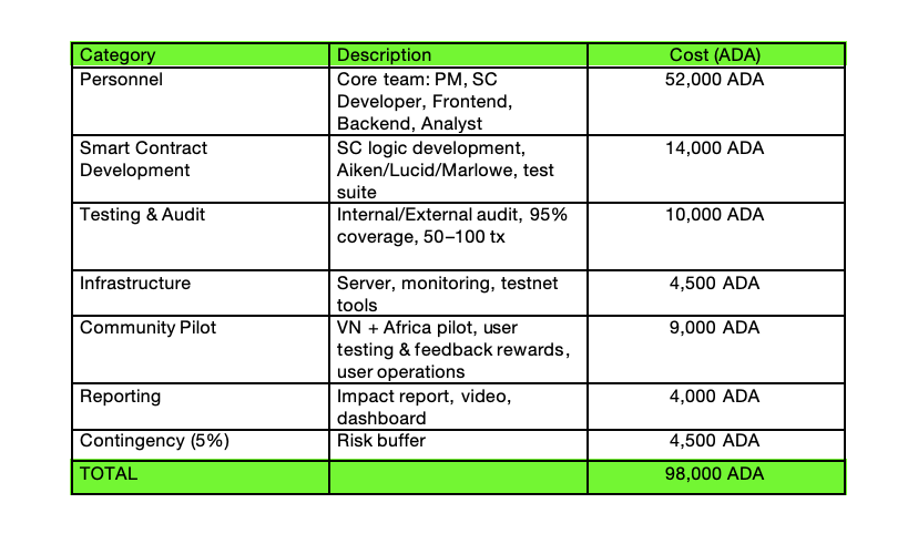 -Because the price of ADA can fluctuate during the project, if the price drops, we will have a backup capital plan supported by other organizations to ensure safety during project implementation. And in the opposite case, if the value of ADA exceeds the initial estimate, we will consider this as a source of reinvestment capital for the project to be able to set up and add some features to the project in the next phase such as: test external code audit, Analytics Dashboard, Localization, Mutil-Group Management.