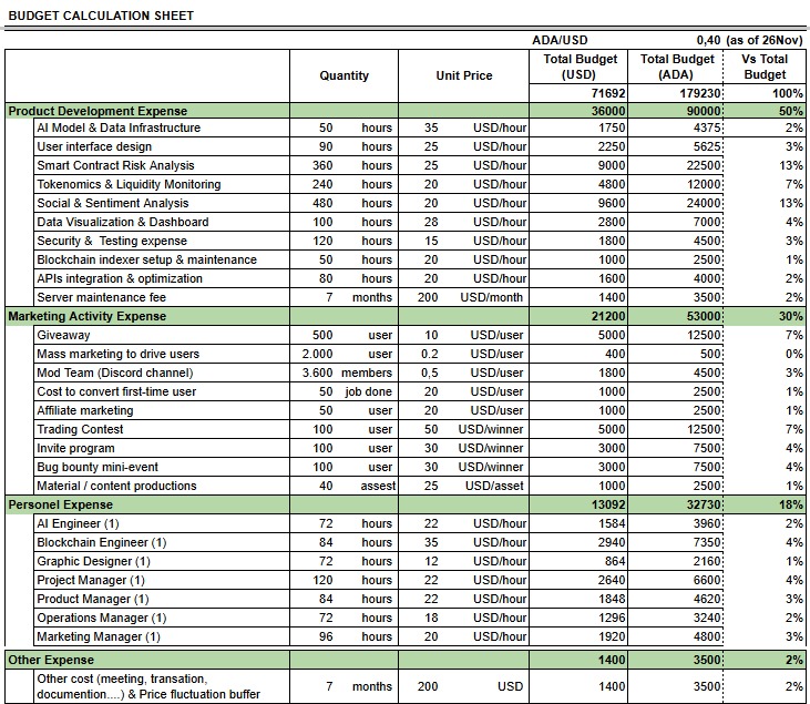 Total budget proposed in this proposal: 180,000 ADA (2% risk management of over total budget)